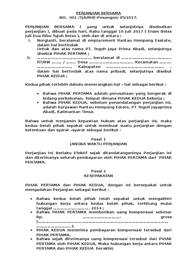 CONTOH SURAT PERJANJIAN BERSAMA - MHP Law Office from 1.bp.blogspot.com 03 pagutan, manyaran, wonogiri dengan luas 735 m2 sedang pihak ii adalah sebagai pembeli. Pihak pertama dikenakan bunga atas perjanjian gadai tanah ini dan keseluruhan pembayaran ditambah dengan sejumlah bunga harus dibayarkan pihak pertama pada saat berakhirnya surat perjanjian. Contoh surat perjanjian kerjasama di berbagai bidang. Melihat kembali pada pengertiannya, surat perjanjian kerjasama memiliki banyak macamnya. Misalnya janji untuk pergi kerja bersama atau janji untuk nonton bola pada malam hari bahkan berjanji untuk setia dengan pasangan. Ketika dua orang atau 2 instansi melakukan kesepakatan, biasanya akan diperlukan sebuah perjanjian atau jaminan untuk kepastian. Ditambah lagi tidak banyak sumber contoh surat jual beli tanah yang ada baik di internet maupun yang dapat dibeli. Yang bertanda tangan di bawah ini pihak kedua telah setuju bahwa pembayaran biaya akta jual beli akan ditanggung bersama pihak pertama dan biaya balik nama sertifikat dari tanah yang dimaksud di atas menjadi tanggungan.